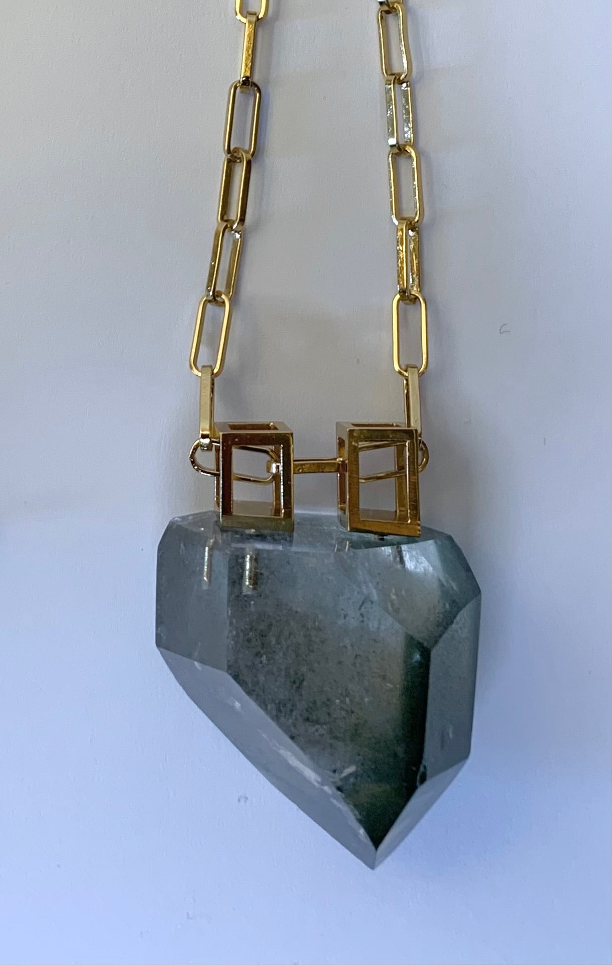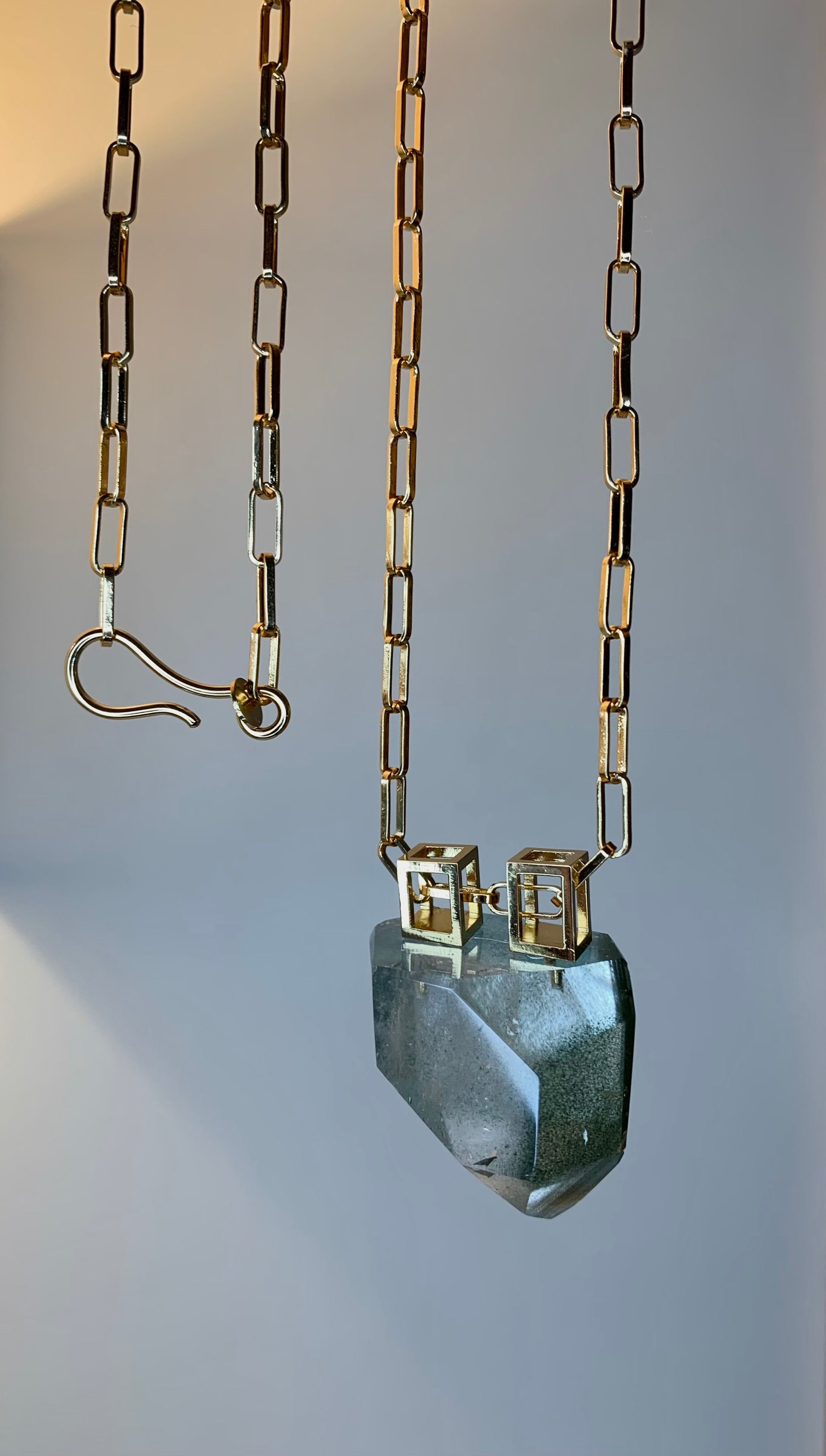 Collana lunga in argento 925/1000, ottone e quarzo verde. Lunghezza catena 80 cm. Galvanizzata oro.