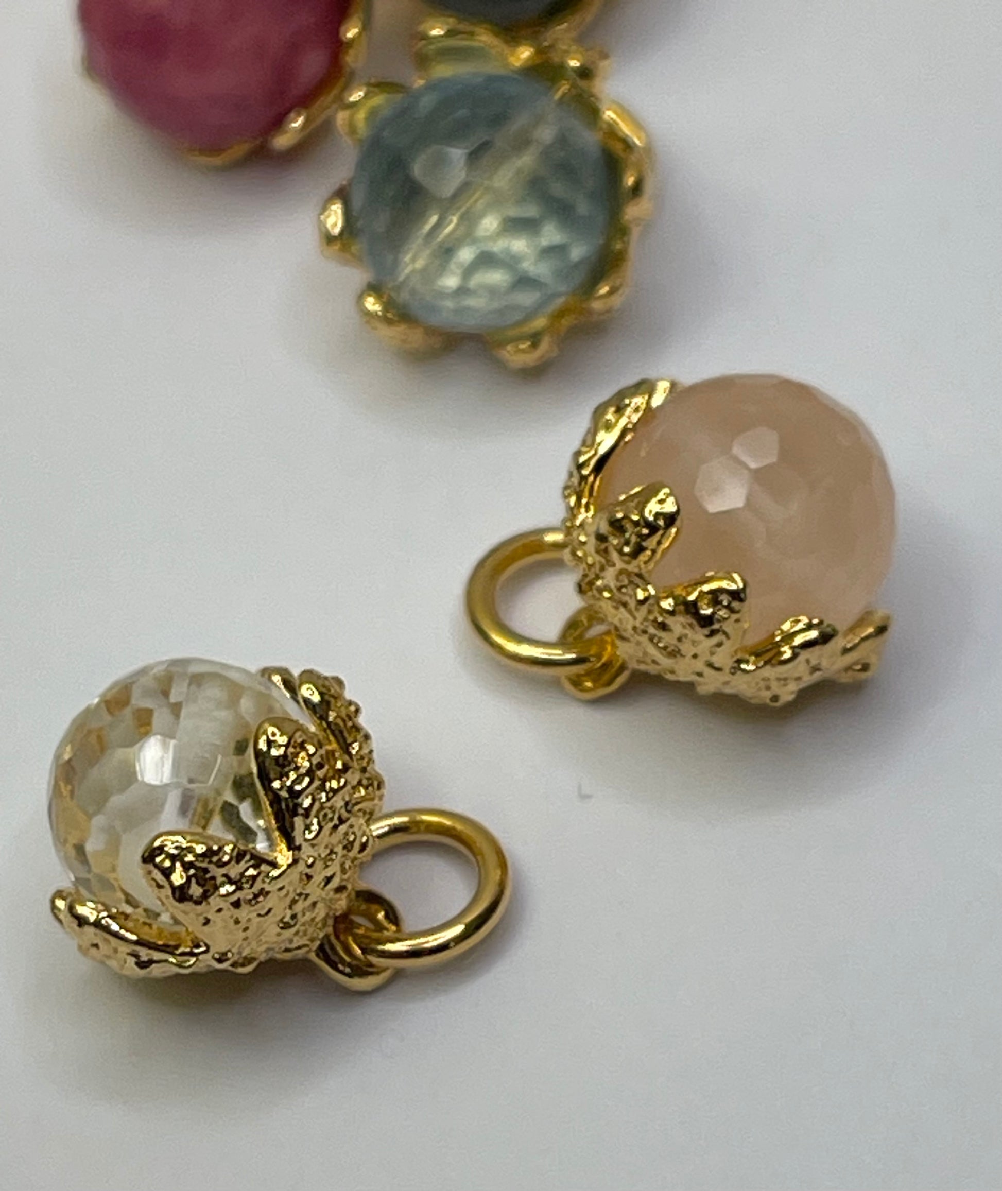 Mughetto in bronzo galvanizzato oro, nelle seguenti varianti: quarzo trasparente, quarzo rosa, topazio azzurro, crisoprasio verde chiaro, crisoprasio verde scuro, agata rossa. Euro 55,00 cad.